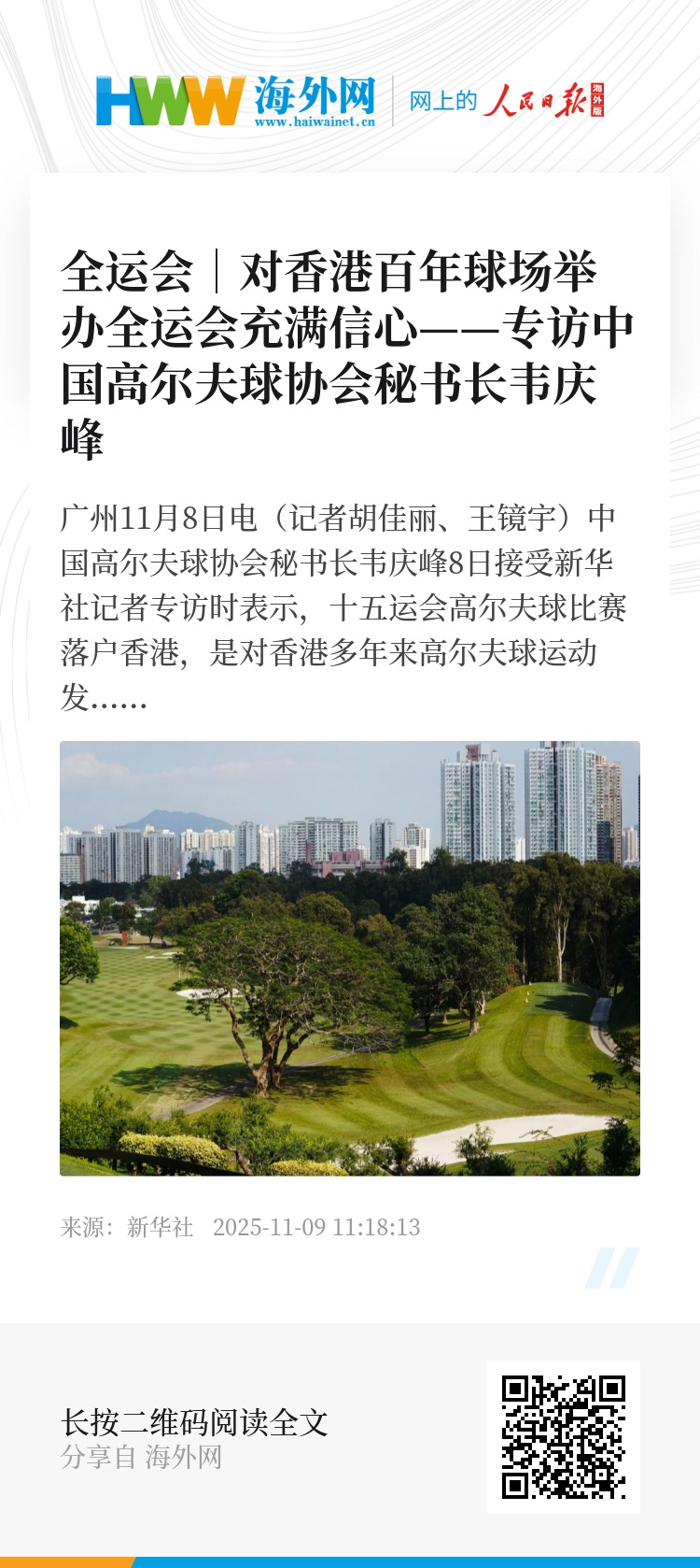 新华社广州11月8日电(记者胡佳丽、王镜宇)中国高尔夫球协会秘书长韦庆峰8日接受新华社记者专访时表示,十五运会高尔夫球比赛落户香港,是对香港多年来高尔夫球运动发展成果的肯定,他对赛事的成功举办充满信心。