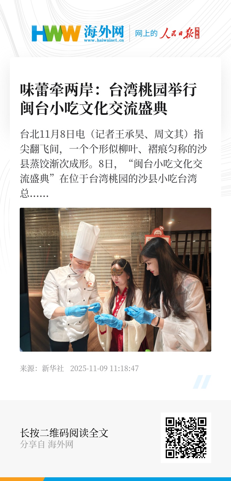 新华社台北11月8日电(记者王承昊、周文其)指尖翻飞间,一个个形似柳叶、褶痕匀称的沙县蒸饺渐次成形。8日,“闽台小吃文化交流盛典”在位于台湾桃园的沙县小吃台湾总部旗舰店举办。6位沙县小吃技艺传承人现场献艺,并与多位台湾嘉宾就两岸饮食文化等内容交流研讨。