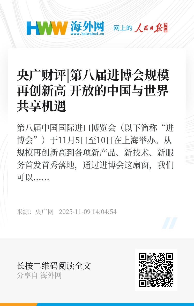 进博会的持续举办,体现出中国推动更高水平开放的决心,是中国推动建设开放型世界经济的生动实践,为世界经济增长作出重要贡献。第八届虹桥国际经济论坛发布的《世界开放报告2025》显示,1990年至2024年,中国开放指数从0.5891升至0.7634,35年间提升近三成,升幅位居全球前列。包括进博会在内,中国的一系列开放实践,也为全球经济发展带来了源源不断的新动能。2024年,中国是150多个国家和地区的主要贸易伙伴,高水平开放已成为对中国好、对世界好的大事业。