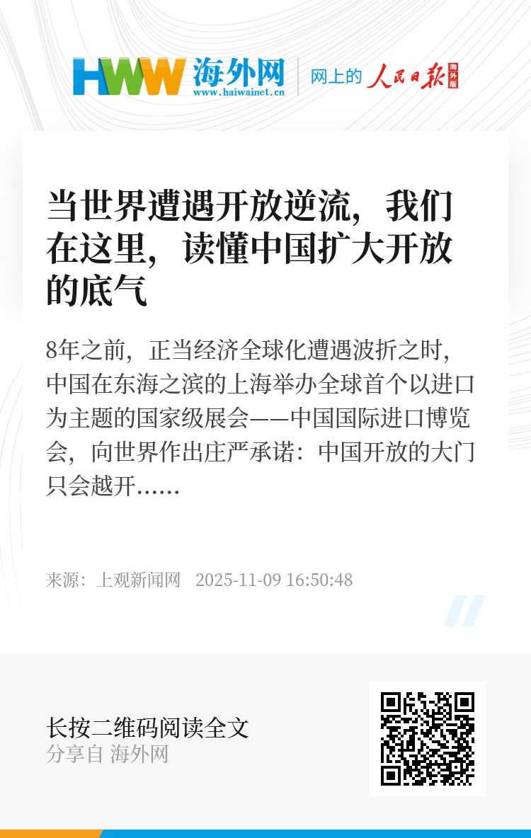 8年后的第八届进博会现场,最新公布的《世界开放报告2025》显示,世界开放指数同比继续下降,世界开放水平仍处于收缩通道。在如此波谲云诡的世界局势中,越办越好的进博会愈发可贵。它宛如一盏矗立于东方的引航灯塔,用一道温暖的光束,照亮了世界合作共赢的前行之路。