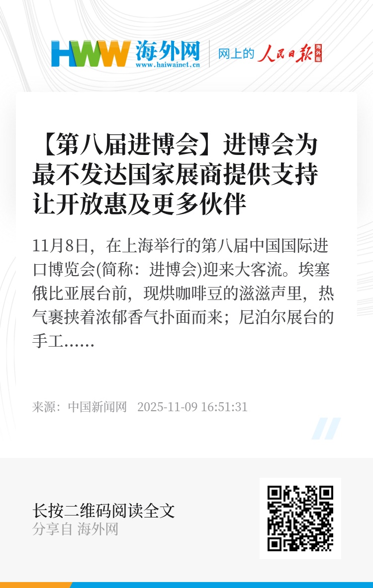 据了解,本届进博会还面向最不发达国家开展跨境电商运营培训,使得参展、培训、签约成为可持续发展的完整链条。为最不发达国家产品提供支持,不仅为参展商解锁了中国市场的新机遇,更让他们真切体会到中国的开放包容,为国际合作走深走实注入持久动力。