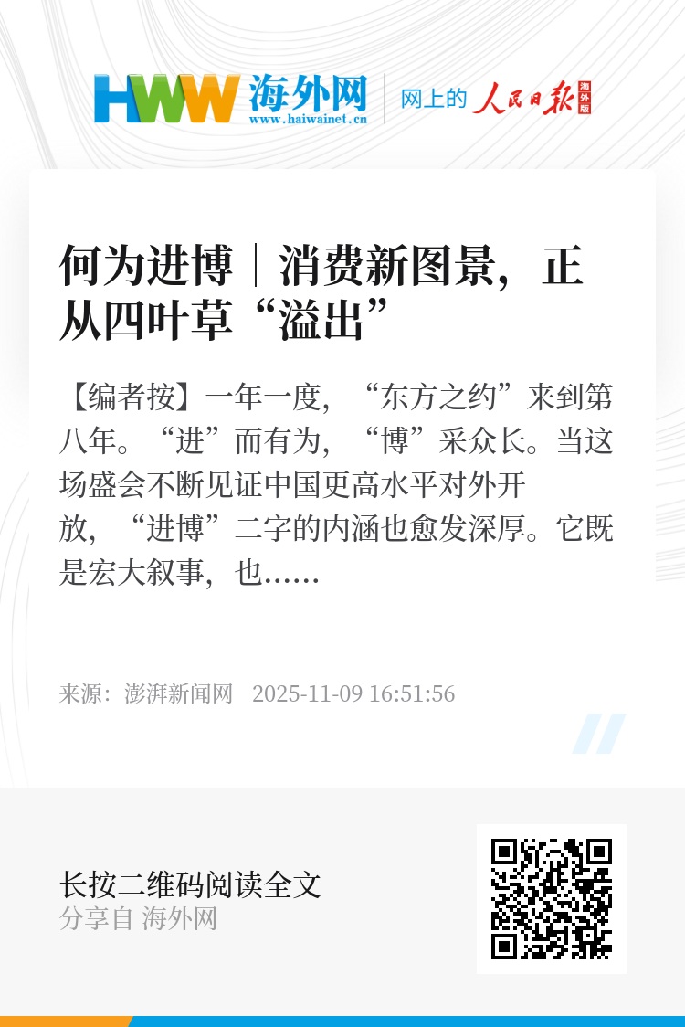 从“四叶草”出发,进博之光正持续照亮消费未来,为构建新发展格局、建设强大国内市场注入源源动力。这场永不落幕的盛会,正在书写一个更具韧性、更富活力的消费新时代。(澎湃新闻高级记者 邹娟 实习记者 张云鹏 海报设计 郁斐)