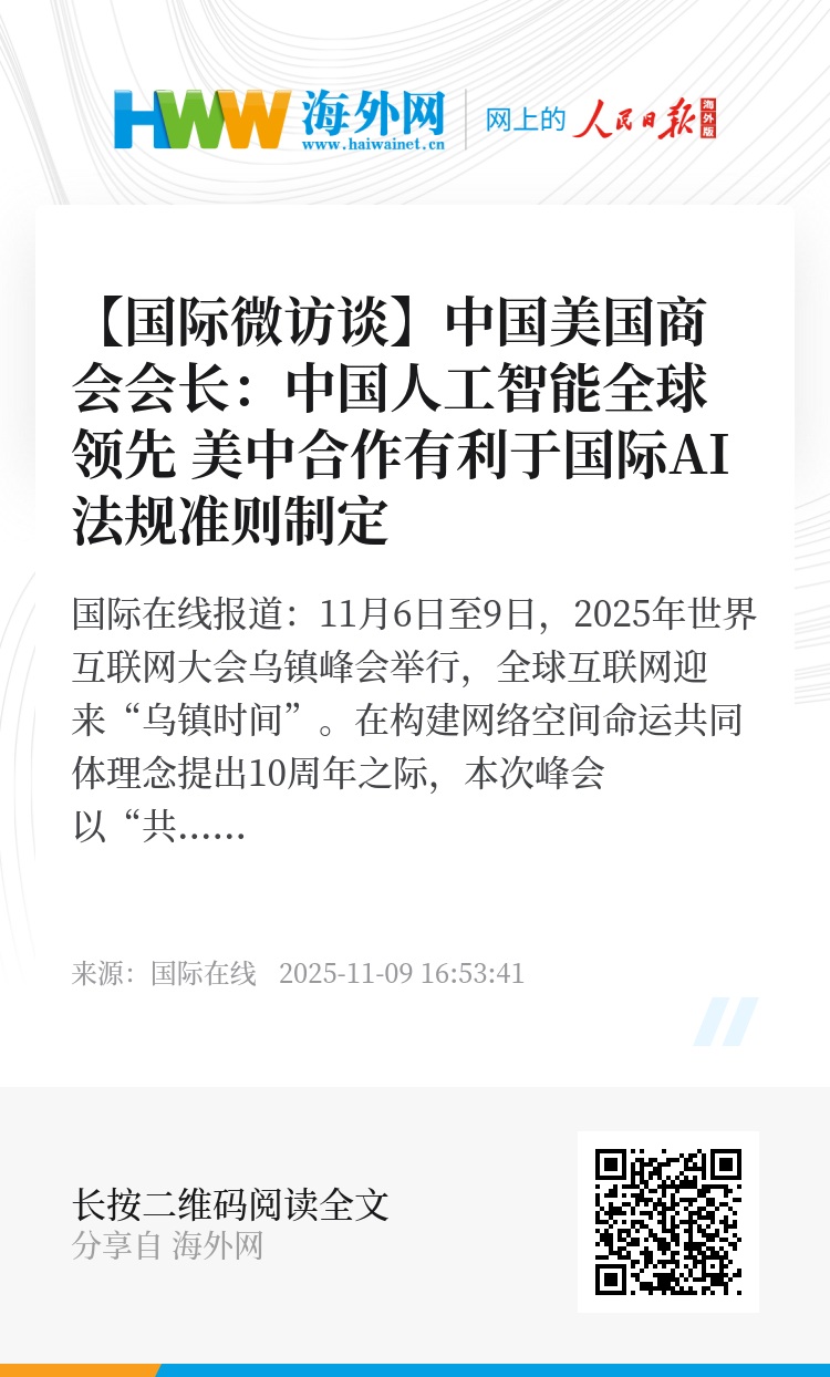 中国美国商会会长何迈可(Michael Hart)接受国际在线记者专访时表示,中美在AI基础研发和应用落地方面均处于全球领先地位。在中国市场,AI技术已深度融入医疗诊断、智能制造等行业场景,展现出强大的创新活力。何迈可指出,中美在AI领域既存在“竞争激发创新”的良性互动,又面临“治理塑造未来”的共同使命。两国企业在技术角逐中相互促进,同时亟需就技术标准、安全规范等治理议题建立对话机制。这种竞合并存的态势,将深刻影响全球人工智能技术的发展方向。