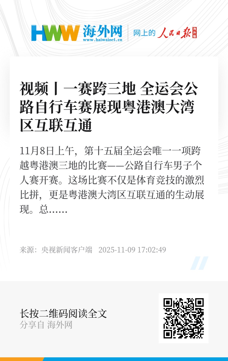 11月8日上午,第十五届全运会唯一一项跨越粤港澳三地的比赛——公路自行车男子个人赛开赛。这场比赛不仅是体育竞技的激烈比拼,更是粤港澳大湾区互联互通的生动展现。