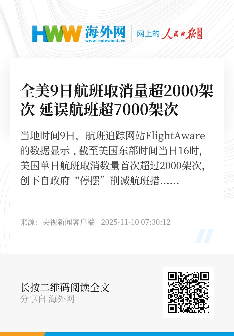 当地时间9日,航班追踪网站FlightAware的数据显示 ,截至美国东部时间当日16时,美国单日航班取消数量首次超过2000架次,创下自政府“停摆”削减航班措施开始以来的新高。同时延误航班也超过7000架次。
