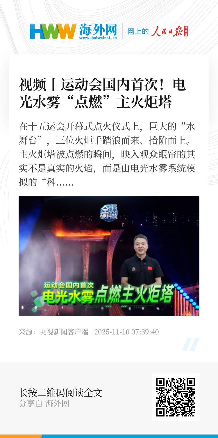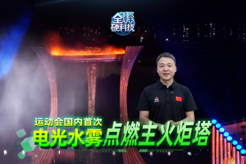 在十五运会开幕式点火仪式上,巨大的“水舞台”,三位火炬手踏浪而来、拾阶而上。主火炬塔被点燃的瞬间,映入观众眼帘的其实不是真实的火焰,而是由电光水雾系统模拟的“科技火焰”!