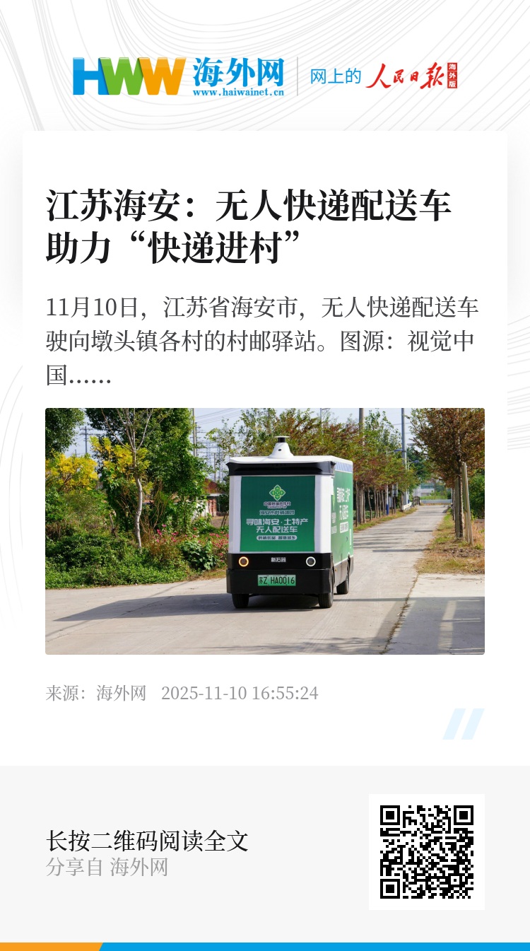 32907776,.江苏海安:无人快递配送车助力“快递进村”,.2025-11-10 16:55:24,.204589,.黄之安、姚凯红