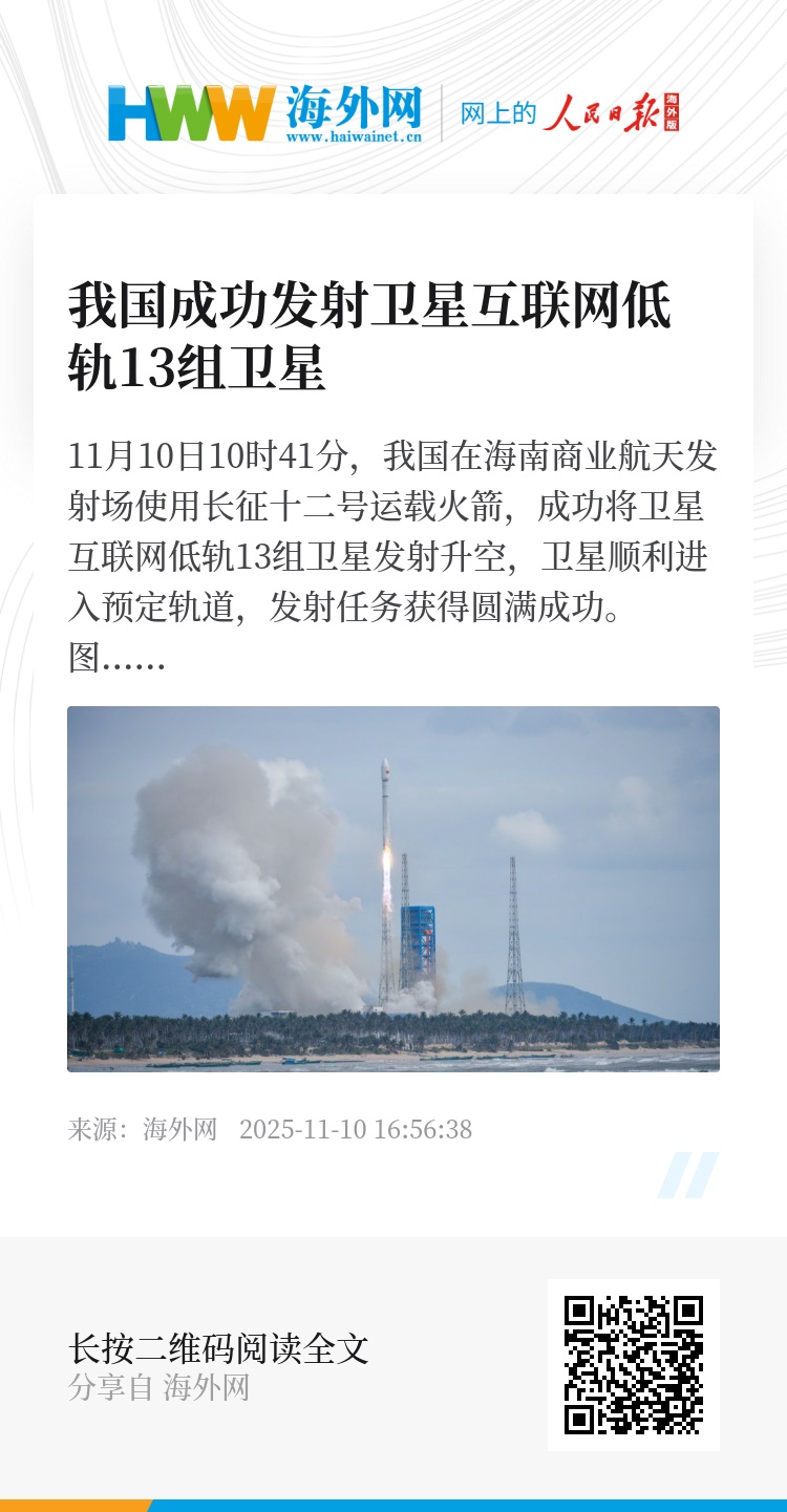 11月10日10时41分,我国在海南商业航天发射场使用长征十二号运载火箭,成功将卫星互联网低轨13组卫星发射升空,卫星顺利进入预定轨道,发射任务获得圆满成功。图源:视觉中国