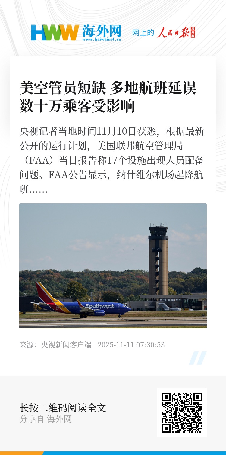 当天稍早前,美国总统特朗普在其社交平台“真实社交”(Truth Social)上发文表示,所有空中交通管制员必须立即返回工作岗位,任何不返回的人都将受到严厉的“处罚”。(央视记者 曹健)