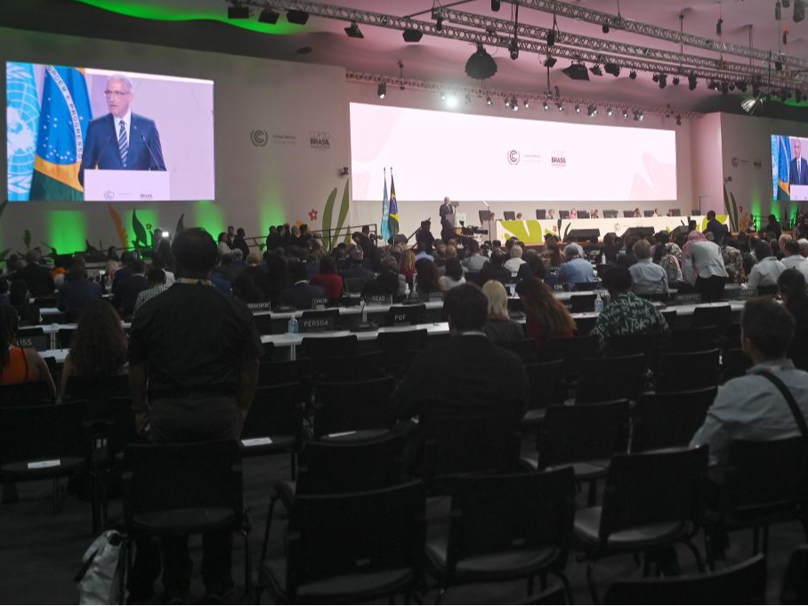 这是11月10日在巴西北部城市贝伦拍摄的《联合国气候变化框架公约》第三十次缔约方大会(COP30)开幕式现场。新华社发(卢西奥·塔沃拉 摄)