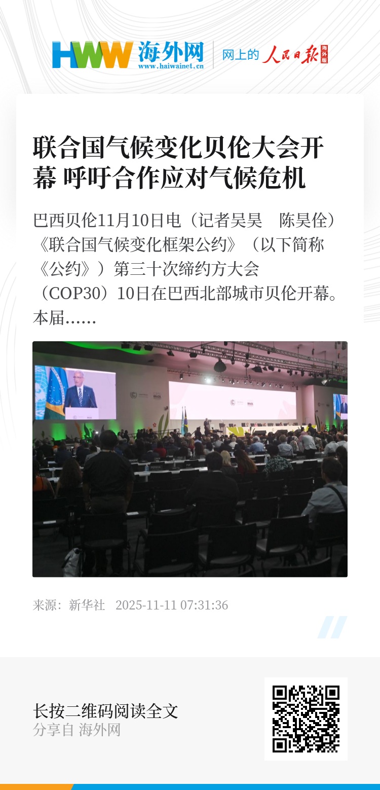 新华社巴西贝伦11月10日电(记者吴昊 陈昊佺)《联合国气候变化框架公约》(以下简称《公约》)第三十次缔约方大会(COP30)10日在巴西北部城市贝伦开幕。本届大会聚焦多项重要气候议题,呼吁全球携手为应对气候危机寻找共同解决方案,加速减少排放,增强气候韧性,推动包容、公正的转型。
