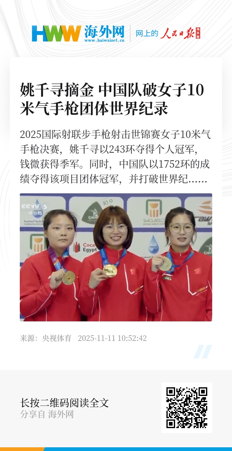 2025国际射联步手枪射击世锦赛女子10米气手枪决赛,姚千寻以243环夺得个人冠军,钱微获得季军。同时,中国队以1752环的成绩夺得该项目团体冠军,并打破世界纪录。
