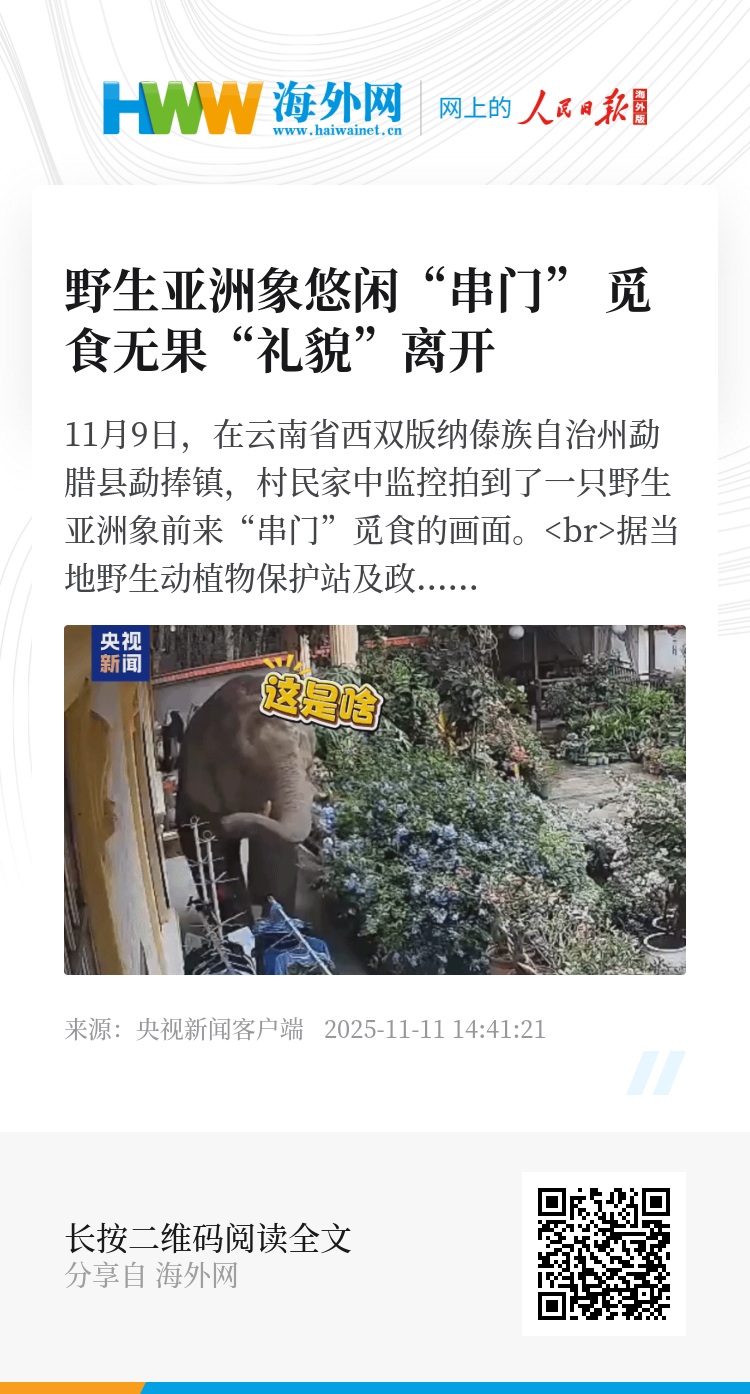 11月9日,在云南省西双版纳傣族自治州勐腊县勐捧镇,村民家中监控拍到了一只野生亚洲象前来“串门”觅食的画面。 据当地野生动植物保护站及政府部门介绍,事发时村民未在家中,暂未接到人员受伤或财产损失报告,目前已确认这只大象返回山林。当地相关部门提醒,野生亚洲象看似温顺,但具有较强攻击性,如偶遇野象,一定要保持冷静,避免刺激野生动物,造成人象冲突。 (总台记者 徐小龙 伊圣楠)