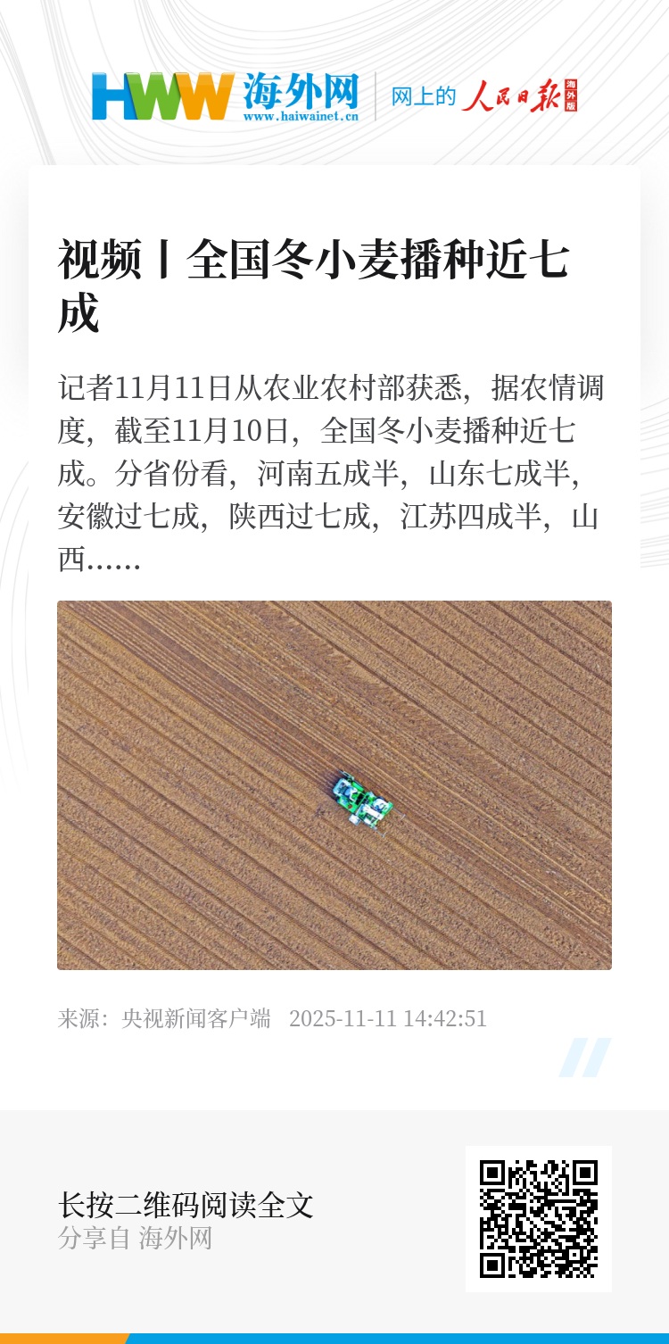 记者11月11日从农业农村部获悉,据农情调度,截至11月10日,全国冬小麦播种近七成。