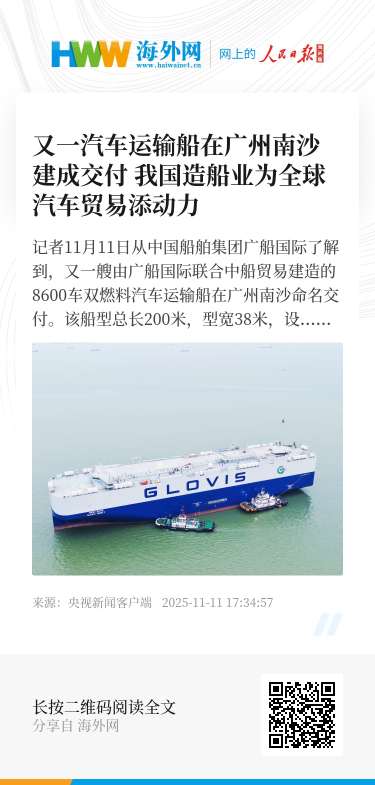记者11月11日从中国船舶集团广船国际了解到,又一艘由广船国际联合中船贸易建造的8600车双燃料汽车运输船在广州南沙命名交付。