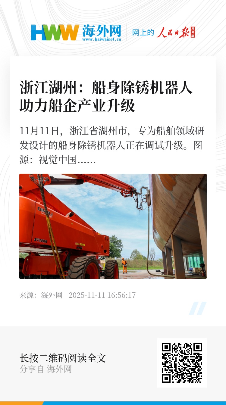 32908049,.浙江湖州:船身除锈机器人助力船企产业升级,.2025-11-11 16:56:17,.204589,.黄之安、王珊宁