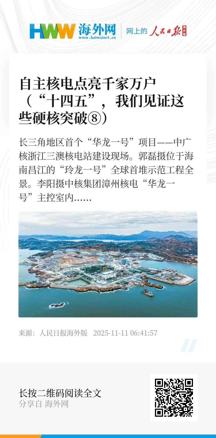 一次次硬核突破、一个个亮眼成果、一组组扎实数据,书写着新时代中国和平利用核能的故事,中国自主核电加速走向世界、造福人类,成为高质量发展的生动注脚。(本报记者 王俊岭)