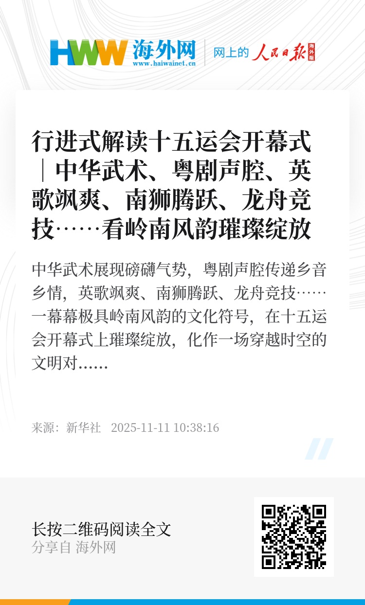 中华武术展现磅礴气势,粤剧声腔传递乡音乡情,英歌飒爽、南狮腾跃、龙舟竞技……一幕幕极具岭南风韵的文化符号,在十五运会开幕式上璀璨绽放,化作一场穿越时空的文明对话,向世界讲述着粤港澳大湾区深厚的文化根脉与澎湃的时代活力。