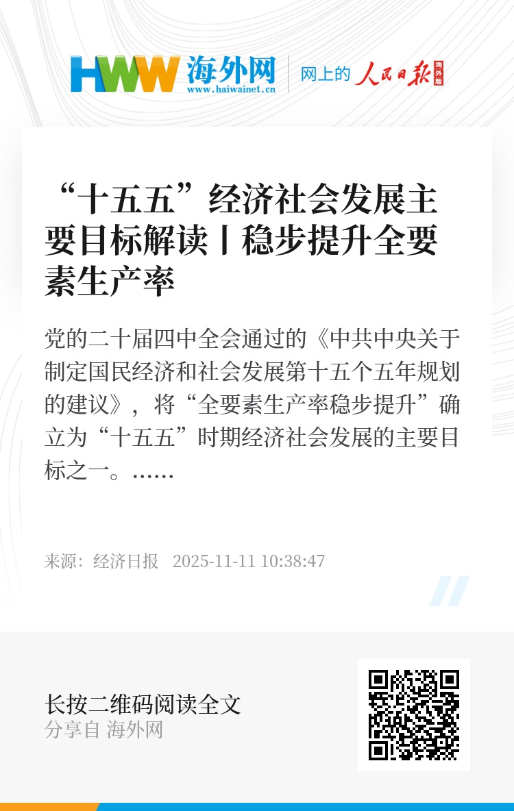 党的二十届四中全会通过的《中共中央关于制定国民经济和社会发展第十五个五年规划的建议》,将“全要素生产率稳步提升”确立为“十五五”时期经济社会发展的主要目标之一。“十五五”时期为何强调全要素生产率提升?又该如何稳步提升全要素生产率?