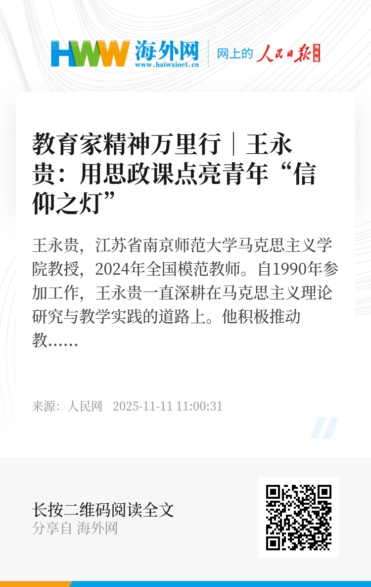 自1990年参加工作,王永贵一直深耕在马克思主义理论研究与教学实践的道路上。他积极推动教学实践创新,推动思政课网络教学平台建设,通过网上学习、交流座谈、社会实践等方式,不断提高思政课的吸引力。他主动研究学生成长成才的规律,把握学生的心理健康状态和思想认识,用真情陪伴他们茁壮成长。他不仅是知识的传播者,而且是学生成长的引路人,教会学生做人、做事、做学问的道理。