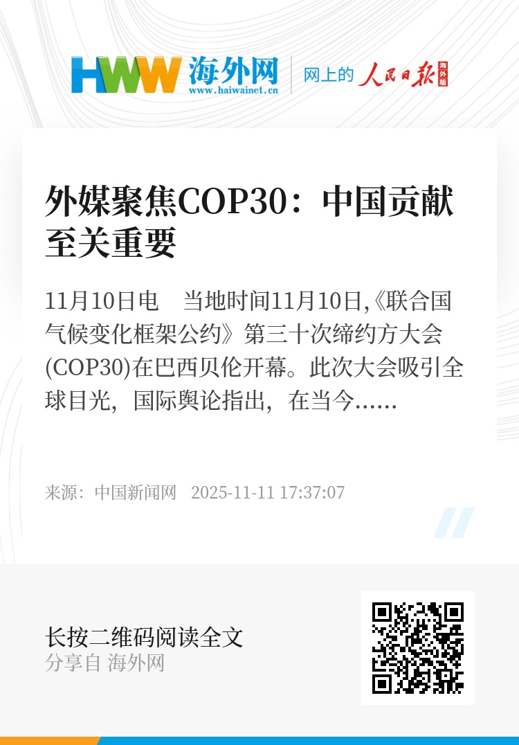 中新网11月10日电 当地时间11月10日,《联合国气候变化框架公约》第三十次缔约方大会(COP30)在巴西贝伦开幕。此次大会吸引全球目光,国际舆论指出,在当今的国际形势下,COP是应对日趋严峻的全球气候变暖的重要平台,而中国所做出的努力与贡献至关重要。