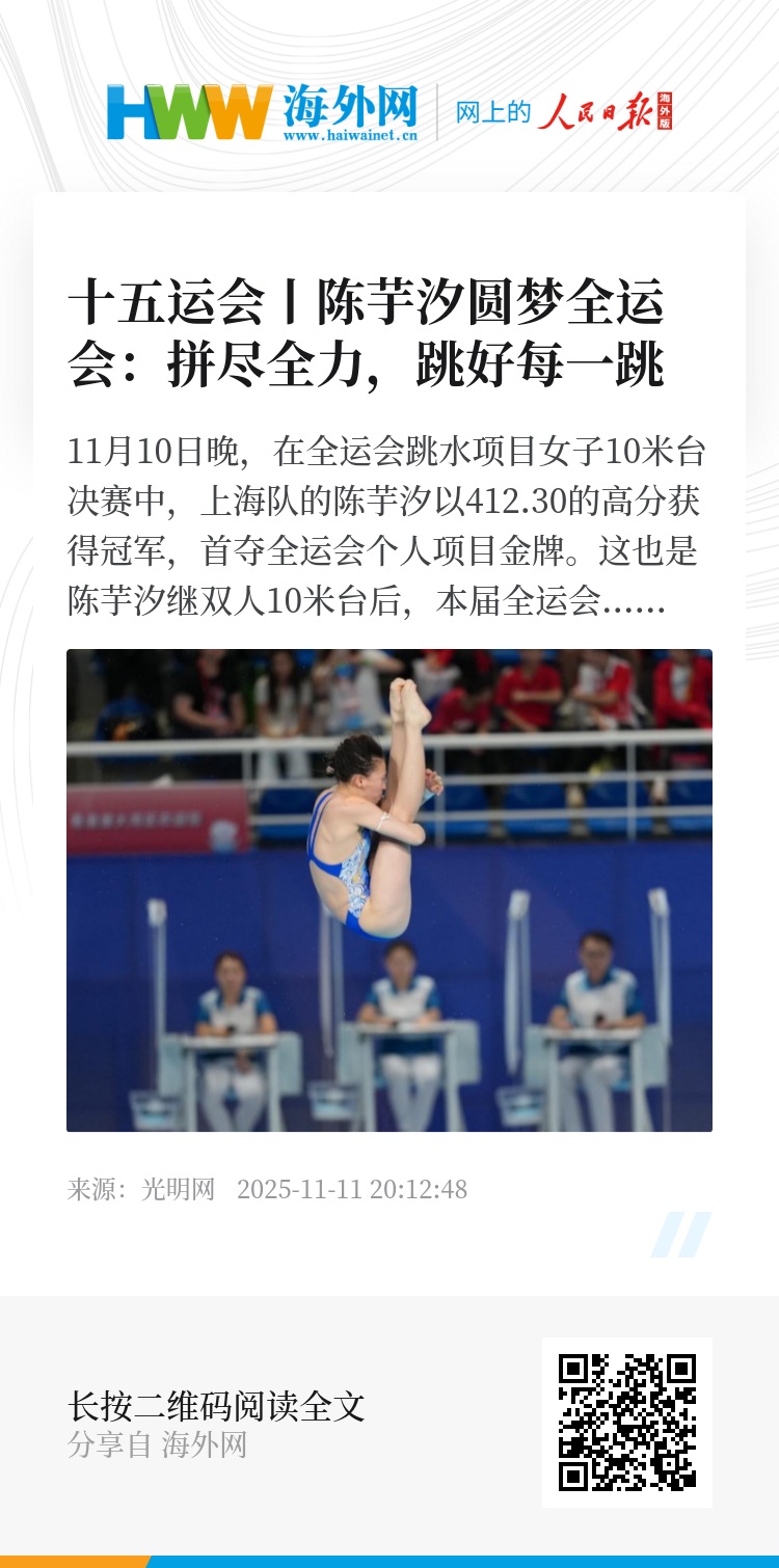 此前,陈芋汐接受媒体采访时曾表示,本届全运会目标就是冲击单人项目冠军。“因为没有拿到过,这次必须全力冲击。”