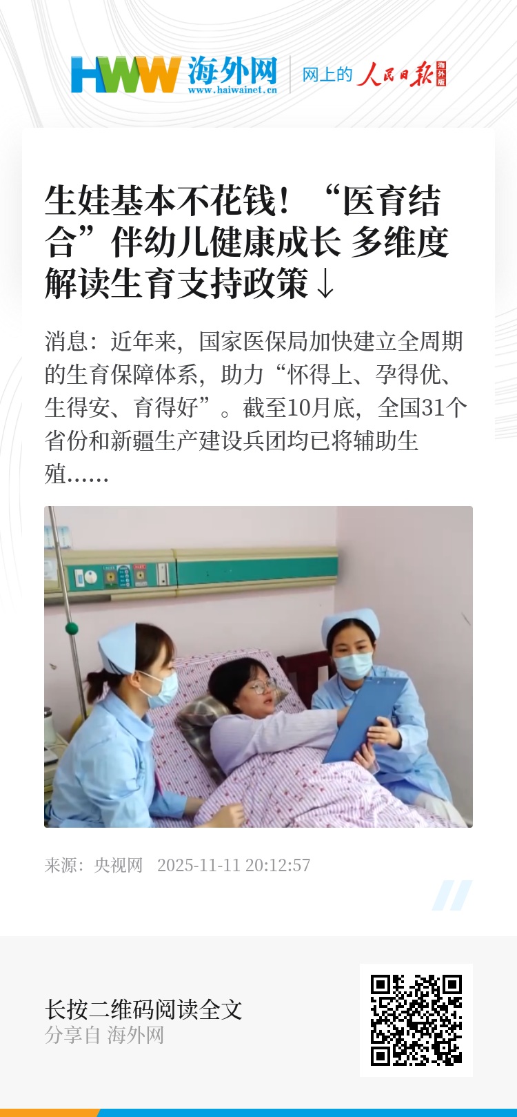 除了生育津贴直发个人,近年来,我国全面提升住院分娩医疗费用保障水平,积极推动政策范围内生育医疗费用全额保障。吉林、江苏、山东等7个省份已率先实现生娃基本不花钱。