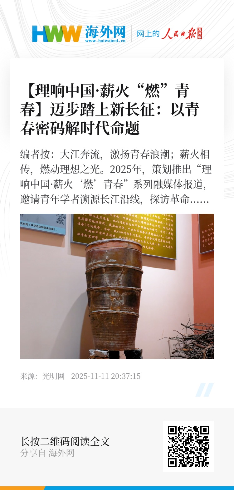 编者按:大江奔流,激扬青春浪潮;薪火相传,燃动理想之光。2025年,光明网策划推出“理响中国·薪火‘燃’青春”系列融媒体报道,邀请青年学者溯源长江沿线,探访革命圣地延安,亲历生态治理的壮阔实践,感悟红色血脉的赓续传承,在见证山河巨变中触摸时代脉搏,生动讲好中国故事背后的精神力量和实践伟力,激励新时代青年在中国式现代化建设中挺膺担当。