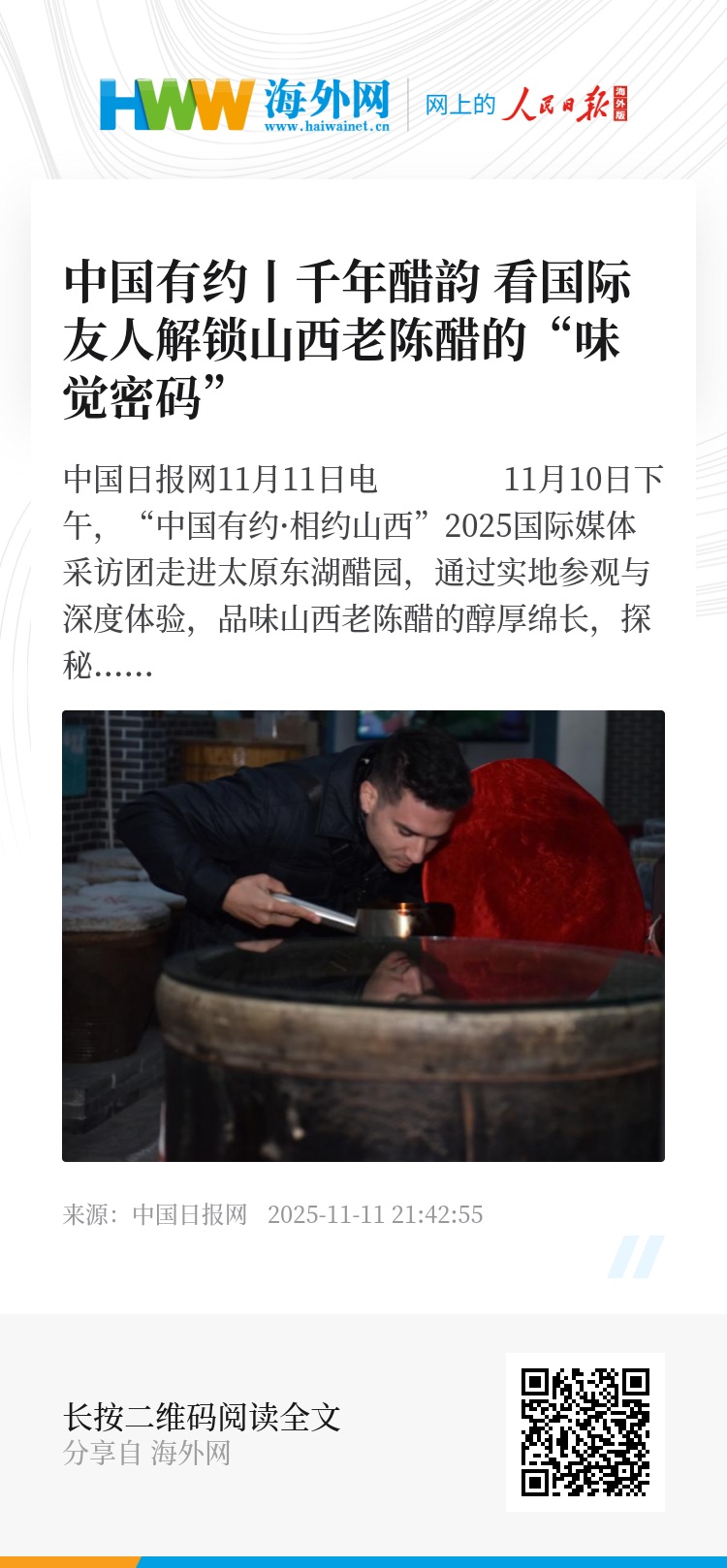 中国日报网11月11日电 11月10日下午,“中国有约·相约山西”2025国际媒体采访团走进太原东湖醋园,通过实地参观与深度体验,品味山西老陈醋的醇厚绵长,探秘这项国家地理标志产品的独特魅力。