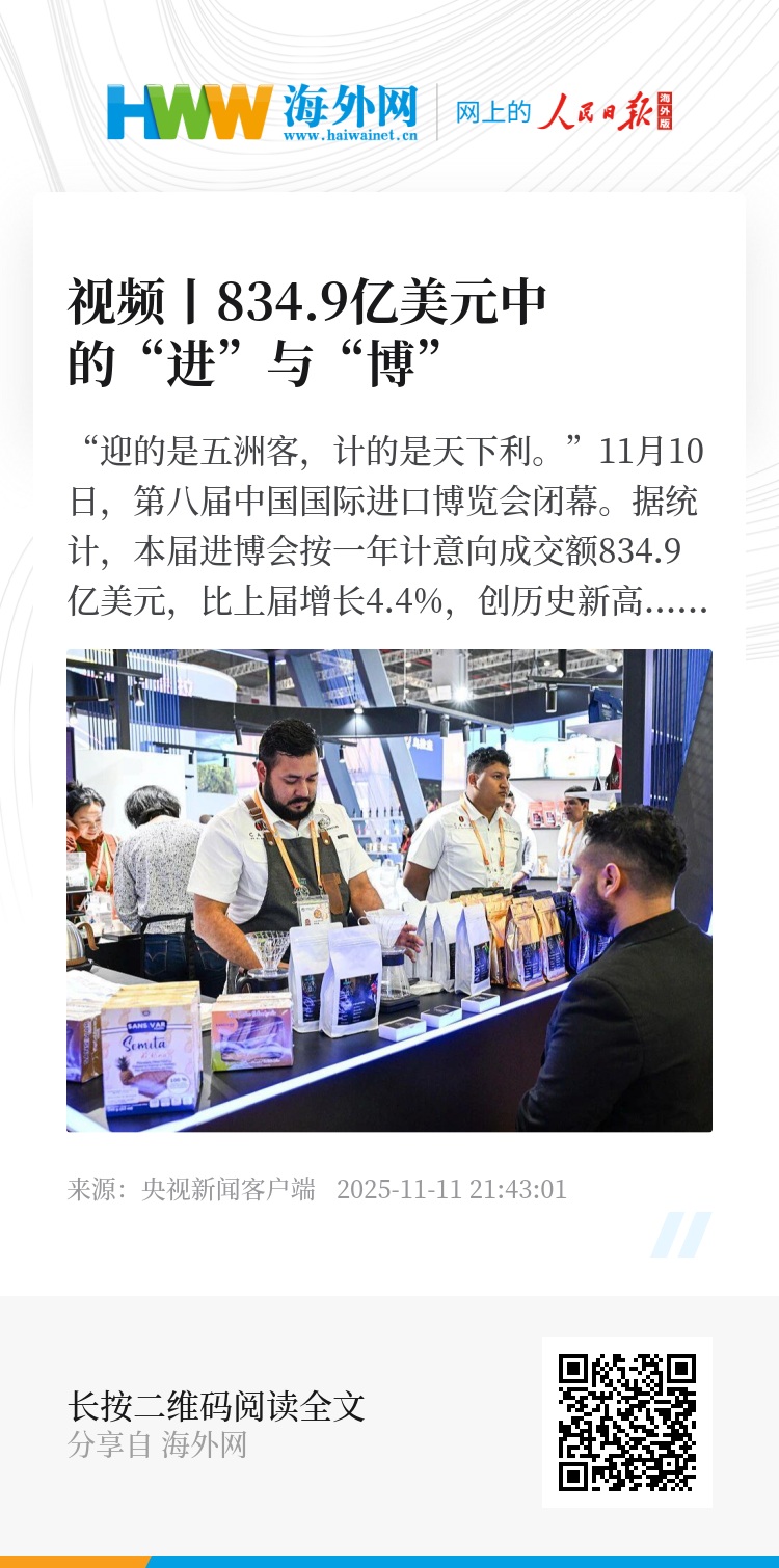 11月10日,第八届中国国际进口博览会闭幕。据统计,本届进博会按一年计意向成交额834.9亿美元,比上届增长4.4%,创历史新高。