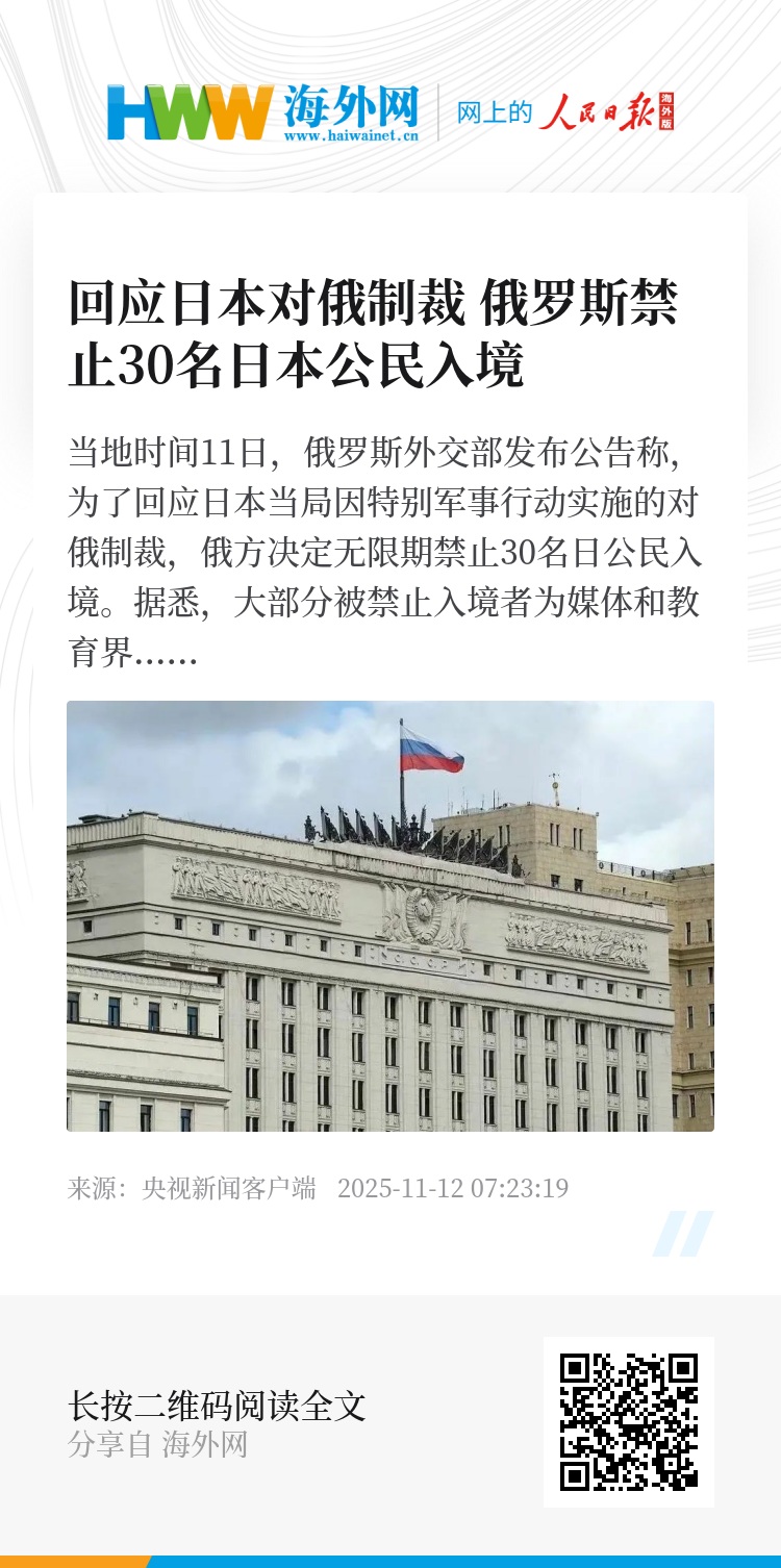 当地时间11日,俄罗斯外交部发布公告称,为了回应日本当局因特别军事行动实施的对俄制裁,俄方决定无限期禁止30名日公民入境。