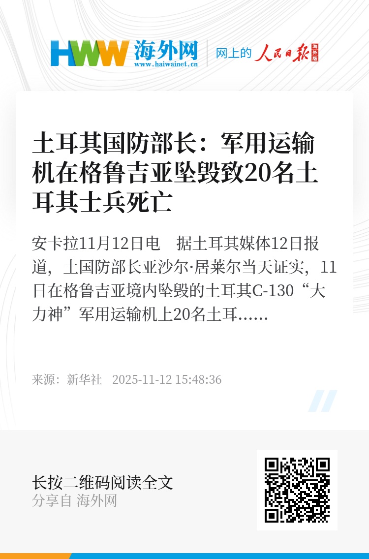 新华社安卡拉11月12日电 据土耳其媒体12日报道,土国防部长亚沙尔·居莱尔当天证实,11日在格鲁吉亚境内坠毁的土耳其C-130“大力神”军用运输机上20名土耳其士兵死亡。