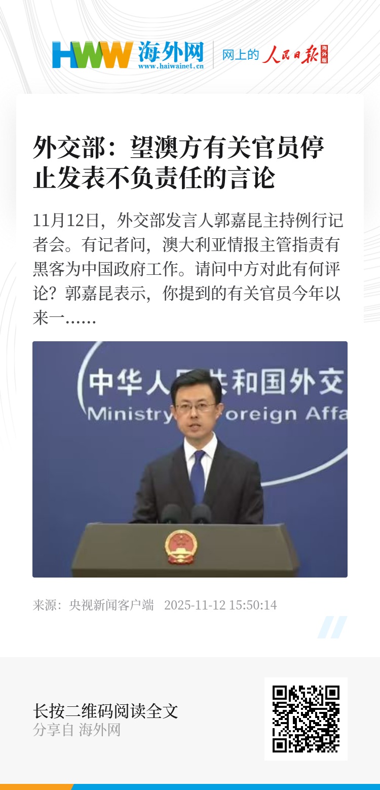 11月12日,外交部发言人郭嘉昆主持例行记者会。有记者问,澳大利亚情报主管指责有黑客为中国政府工作。请问中方对此有何评论?