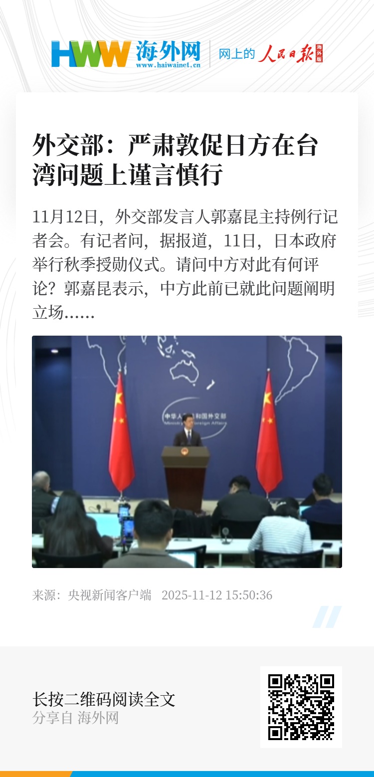 台湾问题是中国核心利益中的核心,事关中日关系政治基础和日方基本信义,是不可逾越的红线。今年是中国人民抗日战争暨世界反法西斯战争胜利80周年,也是台湾光复80周年。中方严肃敦促日方深刻反省历史罪责,恪守中日四个政治文件的有关原则和精神,以实际行动体现坚持一个中国原则的承诺,在台湾问题上谨言慎行,停止向“台独”分裂势力发出任何错误信号。