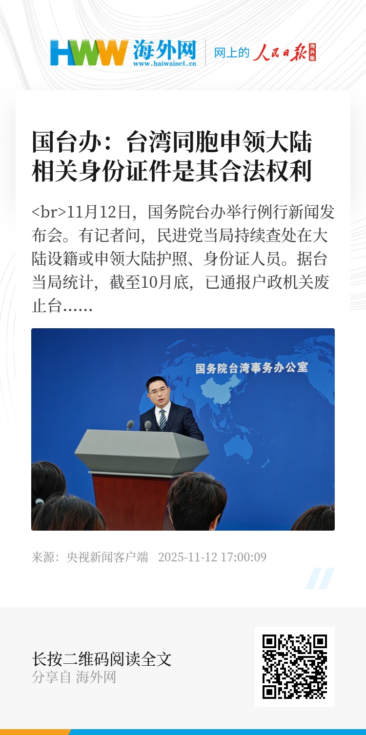 发言人陈斌华表示,台湾同胞申领大陆相关身份证件是其合法权利,有关申领情况和证件信息依法受到严格保护。民进党当局有关行为是剥夺台湾同胞正当权益、制造“绿色恐怖”的又一罪证,必将遭到广大台胞的强烈反对和坚决抵制。