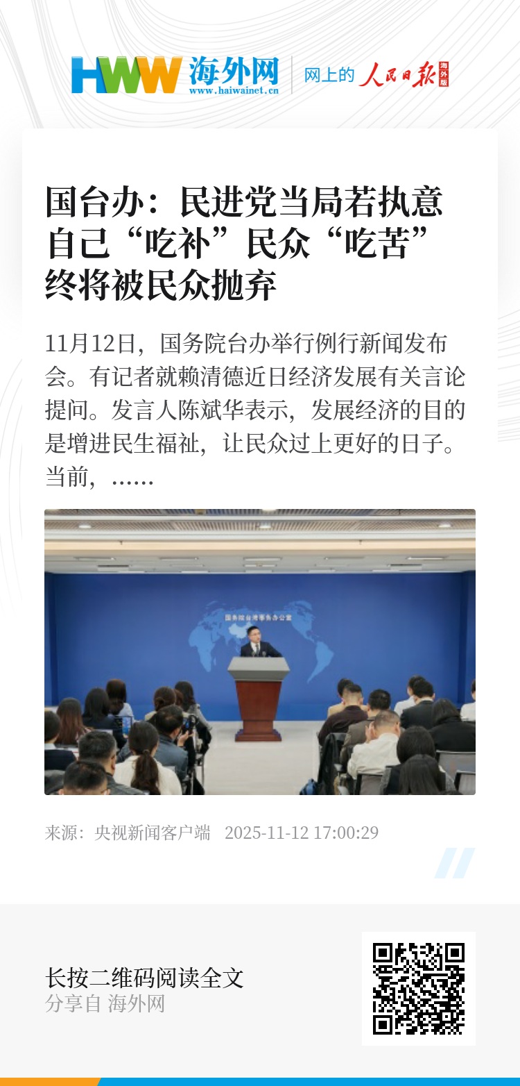 11月12日,国务院台办举行例行新闻发布会。有记者就赖清德近日经济发展有关言论提问。