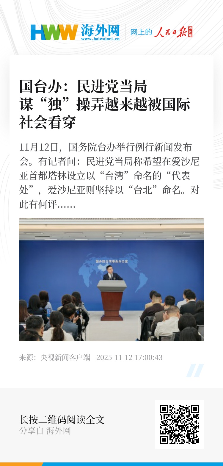 11月12日,国务院台办举行例行新闻发布会。有记者问:民进党当局称希望在爱沙尼亚首都塔林设立以“台湾”命名的“代表处”,爱沙尼亚则坚持以“台北”命名。对此有何评论?