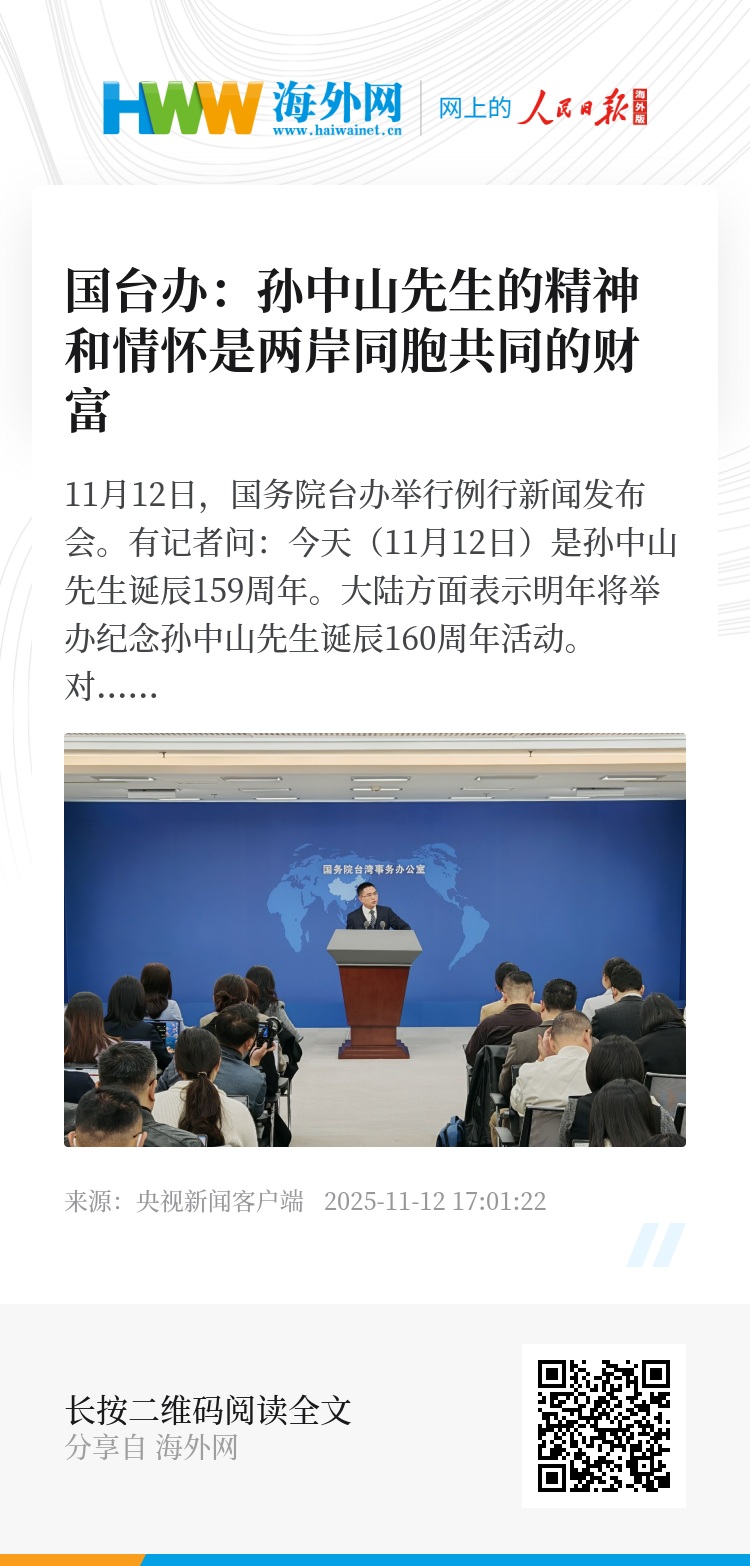11月12日,国务院台办举行例行新闻发布会。有记者问:今天(11月12日)是孙中山先生诞辰159周年。大陆方面表示明年将举办纪念孙中山先生诞辰160周年活动。对此有何评论?