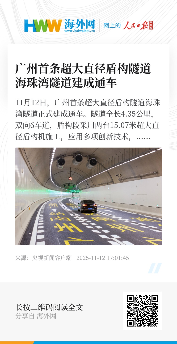 11月12日,广州首条超大直径盾构隧道海珠湾隧道正式建成通车。