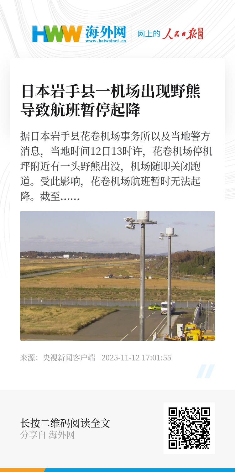 据日本岩手县花卷机场事务所以及当地警方消息,当地时间12日13时许,花卷机场停机坪附近有一头野熊出没,机场随即关闭跑道。