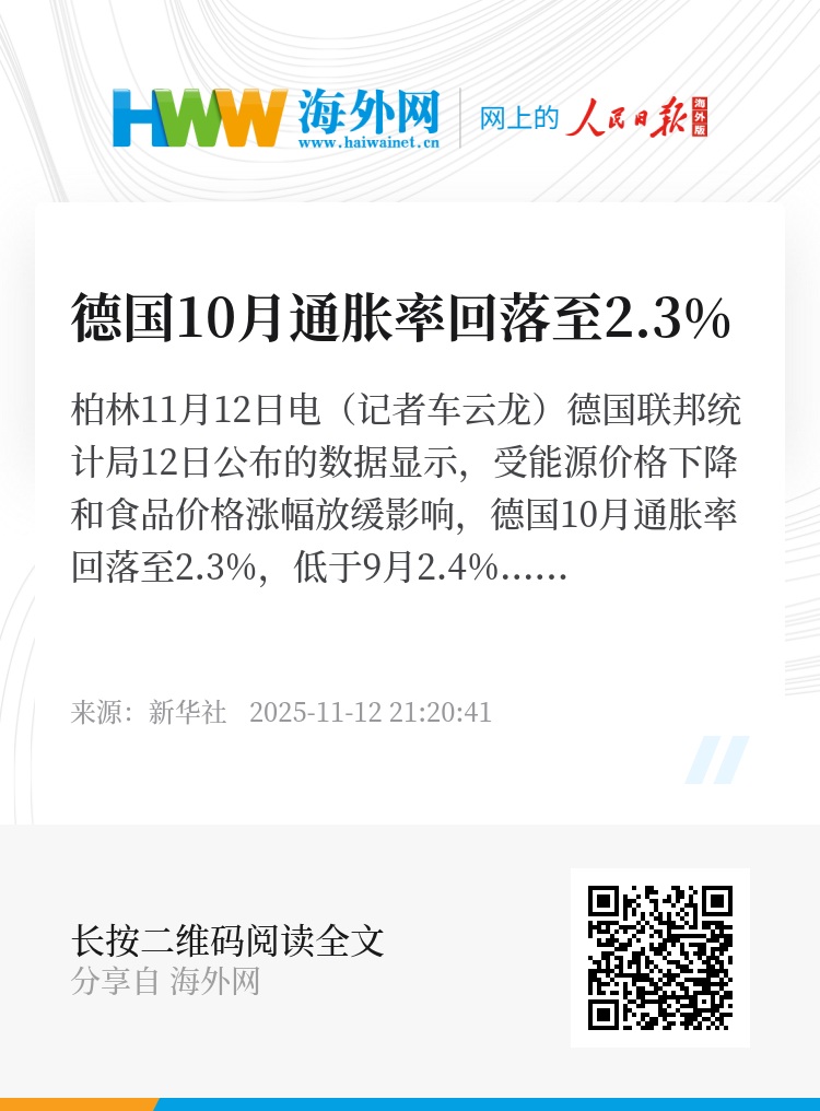 新华社柏林11月12日电(记者车云龙)德国联邦统计局12日公布的数据显示,受能源价格下降和食品价格涨幅放缓影响,德国10月通胀率回落至2.3%,低于9月2.4%的年内高点。