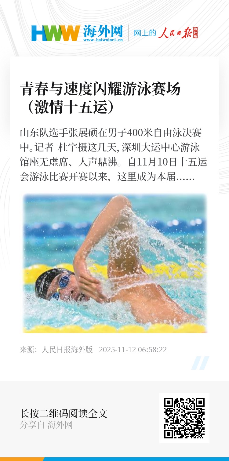 这几天,深圳大运中心游泳馆座无虚席、人声鼎沸。自11月10日十五运会游泳比赛开赛以来,这里成为本届全运会最“热”的赛场之一——热在观众的热情,热在星味十足的泳池,也热在激烈的比拼。来自全国的顶尖泳将同场竞技,水花飞溅间,速度与激情交织,名将与新星竞相闪耀。