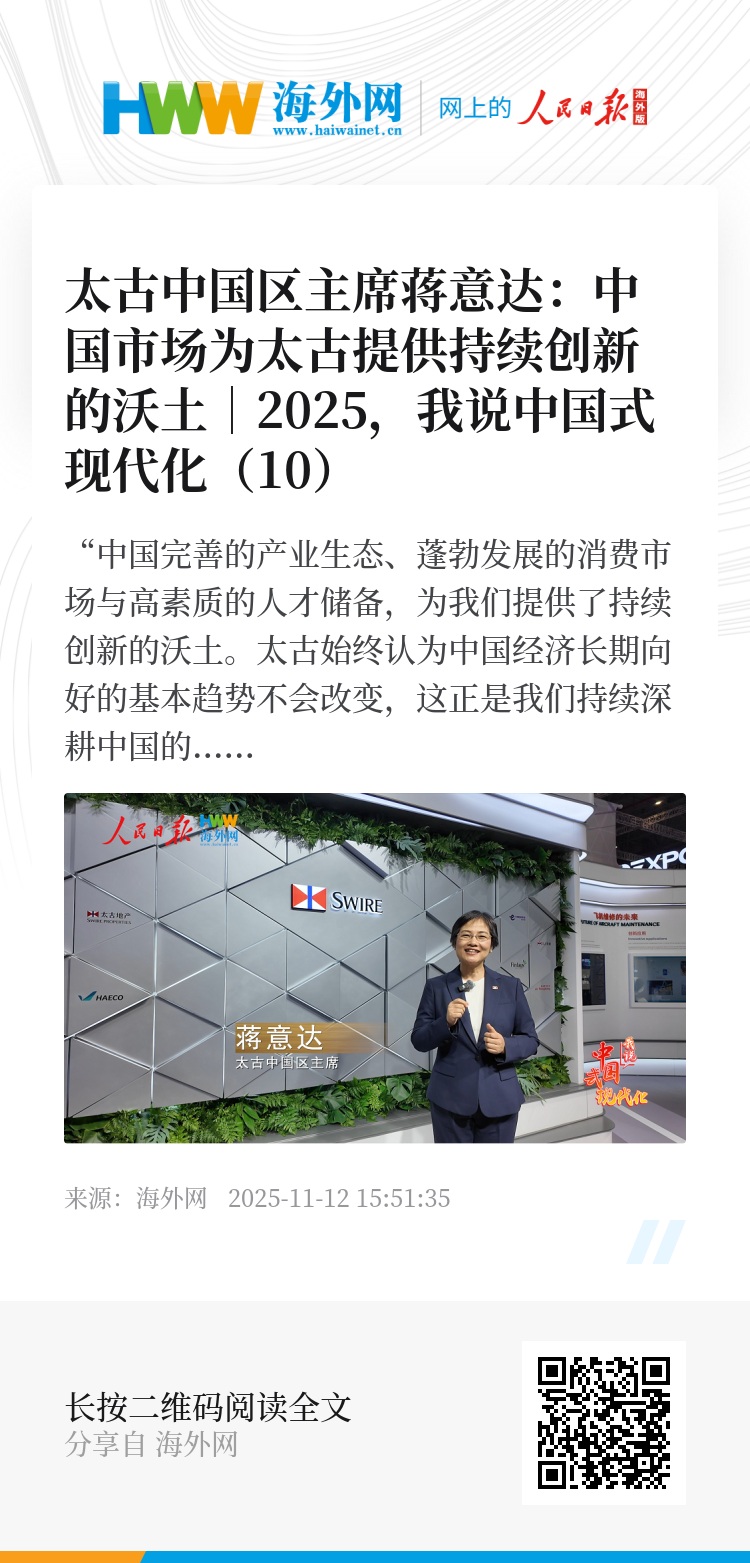在深耕中国市场的进程中,蒋意达发现外资企业如今正在转型,从市场参与者升级为连接全球与中国的“共创伙伴”。“外资企业最能发挥价值的领域在于深度本土化创新——将全球经验与中国洞察相结合,实现从产品到体验的升级,所以我们也在积极探索本地化路径。”蒋意达表示,中国完善的产业生态、蓬勃发展的消费市场与高素质的人才储备,为太古提供了持续创新的沃土,太古也将一如既往地做中国式现代化的见证者、参与者和受益者。(海外网 王珊宁)
