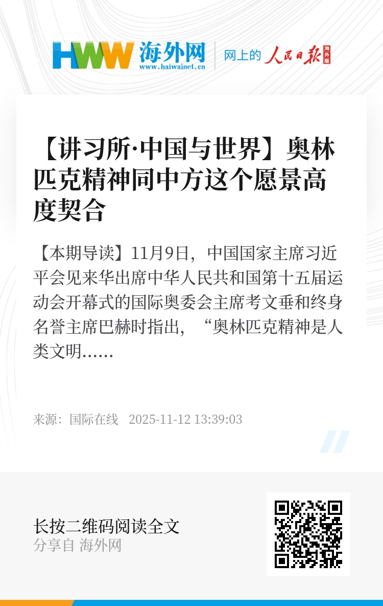 11月9日,中国国家主席习近平会见来华出席中华人民共和国第十五届运动会开幕式的国际奥委会主席考文垂和终身名誉主席巴赫时指出,“奥林匹克精神是人类文明的重要内容,寄托着各国人民对建设更美好世界的期盼,同中方推动构建人类命运共同体的愿景高度契合。”