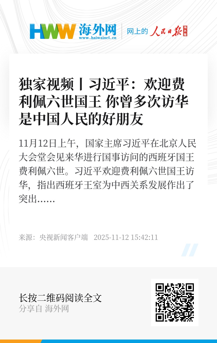 习近平欢迎费利佩六世国王访华,指出西班牙王室为中西关系发展作出了突出贡献。在两国迎来建立全面战略伙伴关系20周年之际,费利佩六世国王对中国进行国事访问,对推动两国友好合作不断向前发展具有重要意义。中方愿同西班牙一道,携手打造更有战略定力、更富发展活力、更具国际影响力的全面战略伙伴关系。