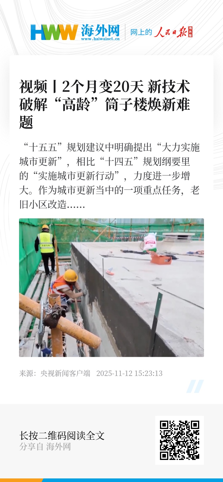 朝阳区管庄东里旧改项目指挥长 王红军:我们通过把大屋脊建筑改造的关键技术、工艺参数、操作规范等整理成标准化的“技术包”,形成可复制的旧改“范本”,推广到北京数千个大屋脊建筑的改造和全国更多的同类型改造当中去,助力破解老旧小区改造中的共性难题。