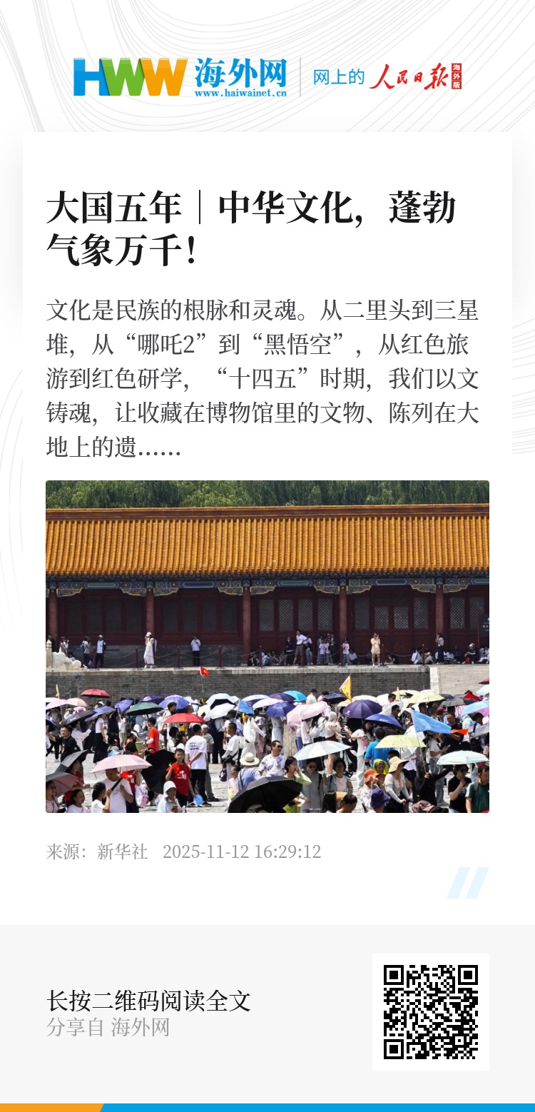 文化是民族的根脉和灵魂。从二里头到三星堆,从“哪吒2”到“黑悟空”,从红色旅游到红色研学,“十四五”时期,我们以文铸魂,让收藏在博物馆里的文物、陈列在大地上的遗产、书写在古籍里的文字“活”了起来;我们以文惠民,让公共文化服务如毛细血管般延伸,精神甘露润泽城乡;我们以文兴业,让优秀传统文化深度融合数字浪潮,文化产业绽放创新活力……