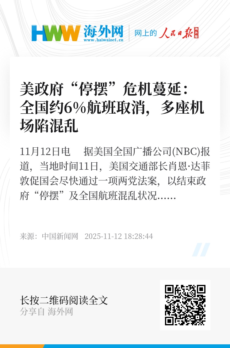 中新网11月12日电 据美国全国广播公司(NBC)报道,当地时间11日,美国交通部长肖恩·达菲敦促国会尽快通过一项两党法案,以结束政府“停摆”及全国航班混乱状况。