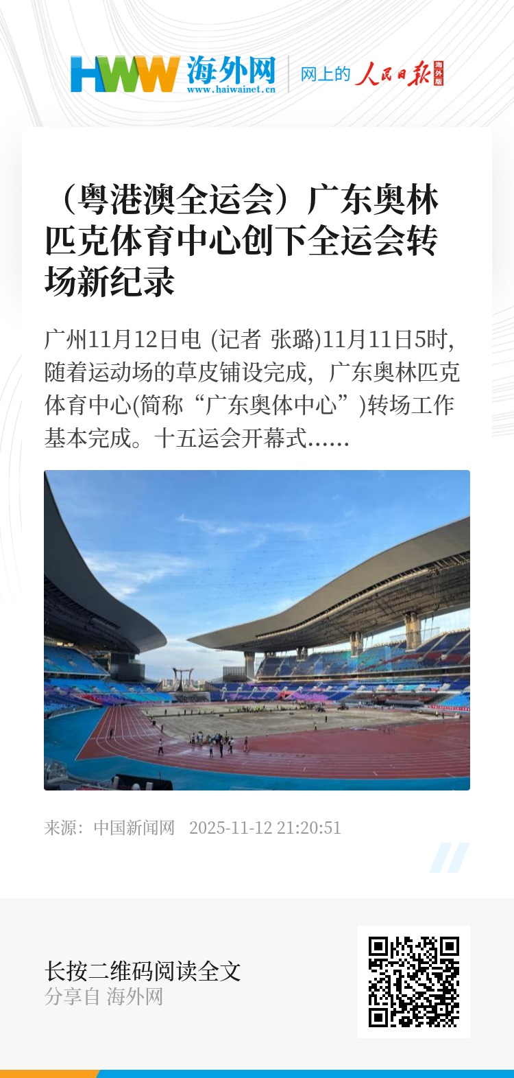 中新网广州11月12日电 (记者 张璐)11月11日5时,随着运动场的草皮铺设完成,广东奥林匹克体育中心(简称“广东奥体中心”)转场工作基本完成。