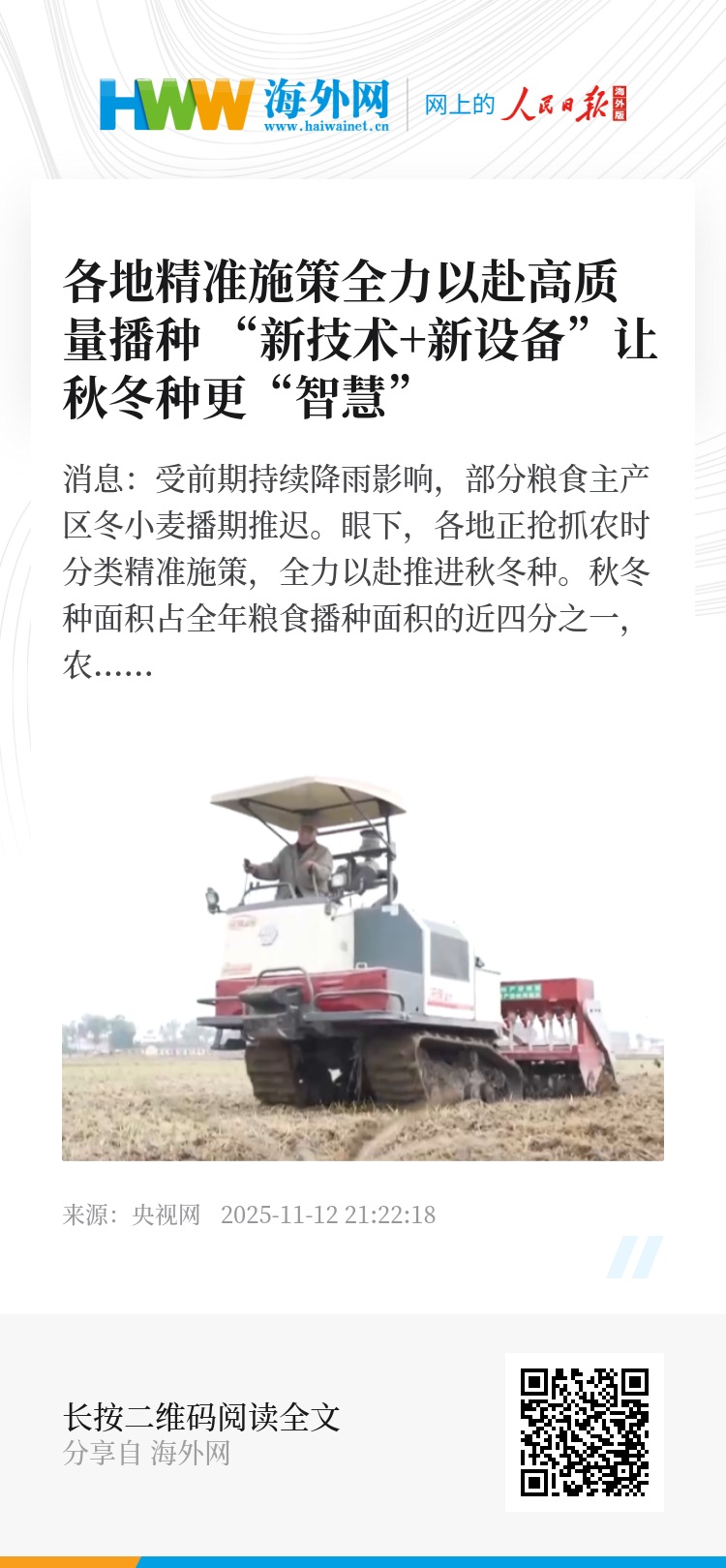 央视网消息:受前期持续降雨影响,部分粮食主产区冬小麦播期推迟。眼下,各地正抢抓农时分类精准施策,全力以赴推进秋冬种。